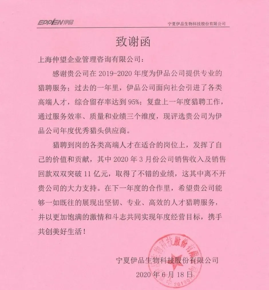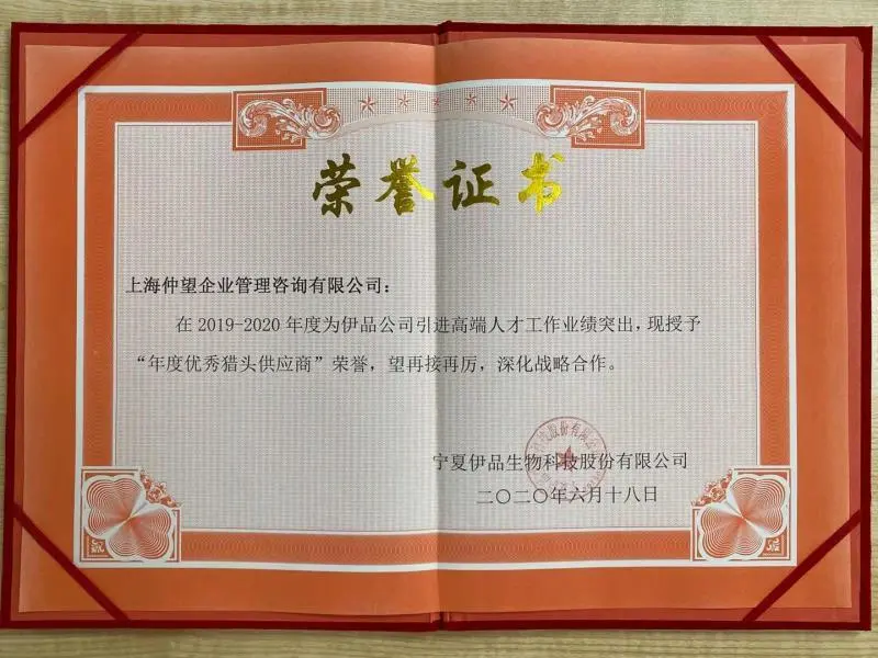 宁夏伊品生物科技公司为仲望农业团队颁发“年度优秀猎头供应商”荣誉证书,并附上致谢函,感谢我司在2019-2020年度所提供的专业猎聘服务,为客户公司招募到优秀的高端人才,为其销售业绩的增长发挥了较大价值。