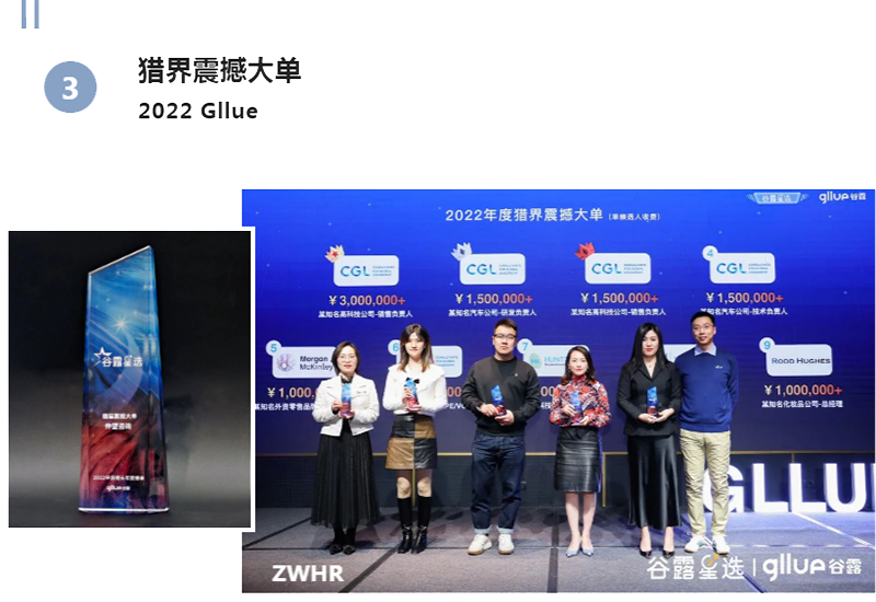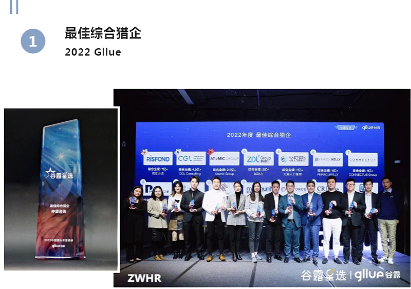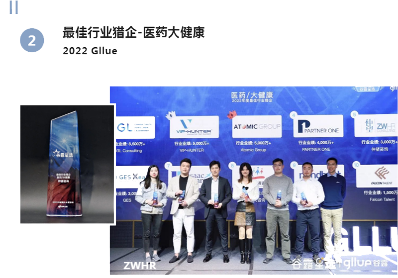 仲望咨询荣获谷露星选2022年度“最佳综合猎企”、“最佳行业猎企-医药/大健康行业”、“猎界震撼大单”。三项荣誉。仲望咨询医药大健康团队 Director Zoe Tang 代表仲望咨询前往领取奖项。