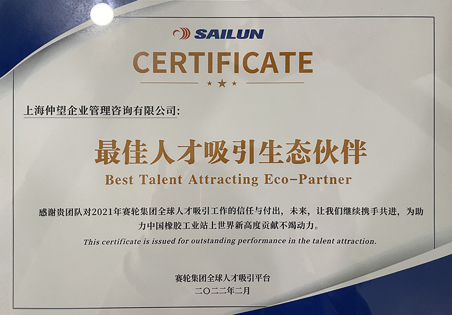 仲望咨询荣获2021年度赛轮集团“最佳人才吸引生态伙伴”。赛轮集团表示:感谢仲望对2021年赛轮集团全球人才吸引工作的信任与付出,未来我们将继续携手共进,为助力中国橡胶工业站上世界新高度贡献不竭动力。
