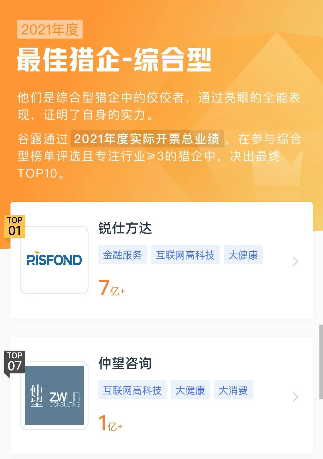经过公开、透明的真实业务数据检验。仲望咨询以2021年度开票业绩1亿+的成绩荣登谷露2021年度最佳猎企(综合型)榜单。