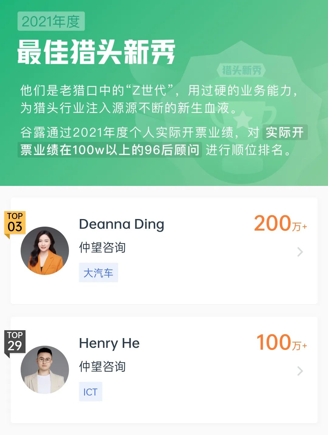 Deanna Ding 与 Henry He 进入最佳猎头新秀榜单(96后猎头新秀,以2021年度个人实际开票业绩排名),其中 Deanna 进入TPO3。
