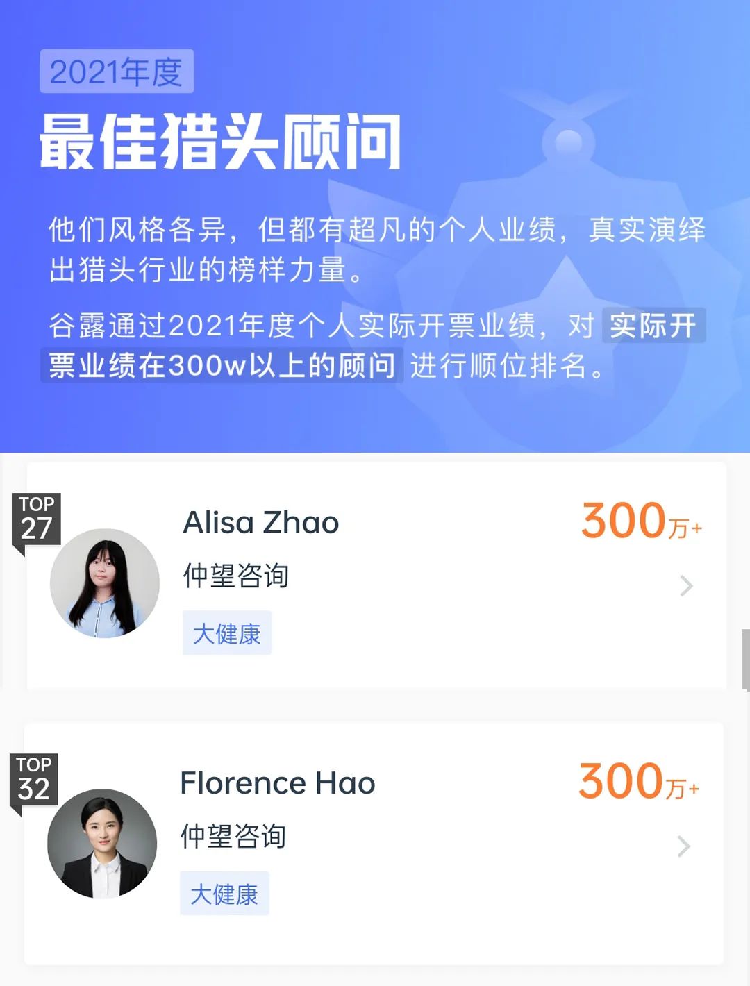 Florence Hao 与 Alisa Zhao 进入最佳猎头顾问榜单(以2021年度个人实际开票业绩为基准)。