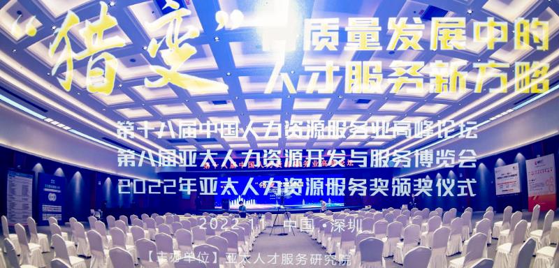 2022年11月5-6日,由亚太人才服务研究院主办的第十八届中国人力资源服务业高峰论坛、第八届亚太人力资源开发与服务博览会及2022亚太人力资源服务奖颁奖仪式在中国·深圳成功举办。
