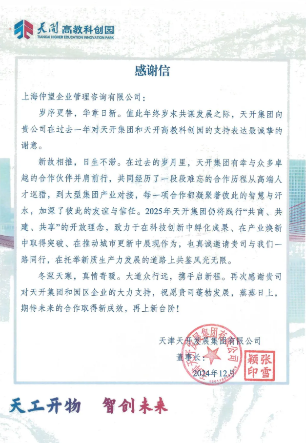 仲望咨询与天开集团的合作历程从高端人才猎寻,到大型集团产业对接,每一项合作都加深了彼此的友谊与信任。同时天开集团也充分肯定了仲望在科创领域,国家级研究院方向专业的招聘实力。
