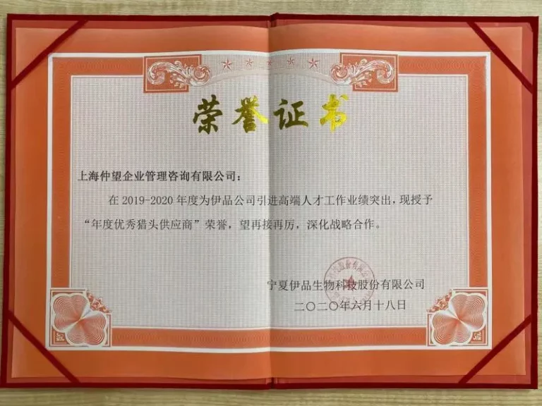 2019-2020年度 宁夏伊品生物科技 优秀猎头供应商